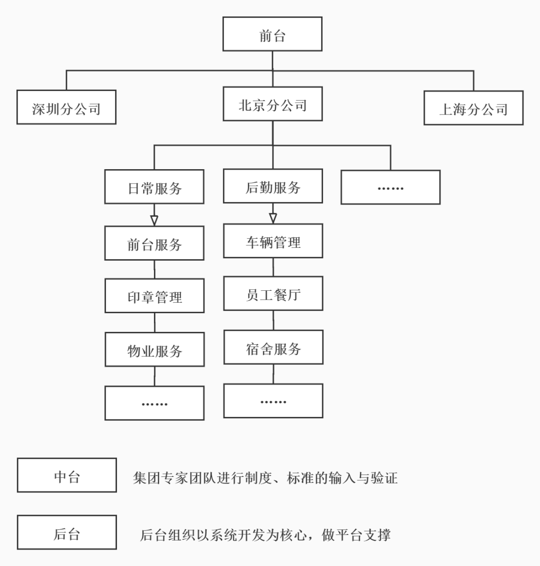 随着企业规模扩大,行政er往往会面临一个难题:如何在解决目标用户需求的同时,完成自身行政支撑系统的更新迭代?这时,就可尝试前中后台型的组织架构,对行政业务进行有效分离,系统性提升业务效率。