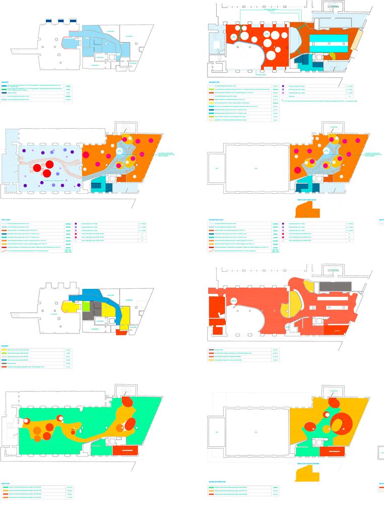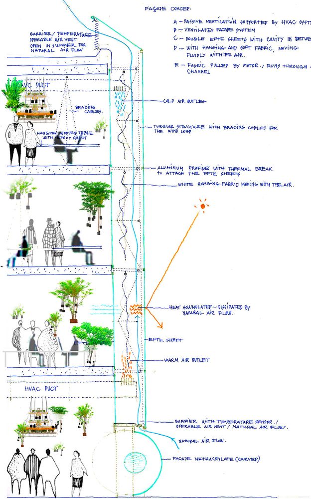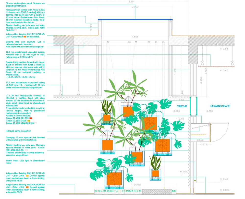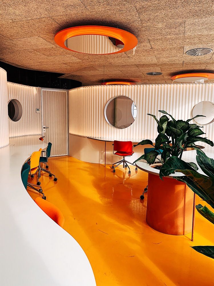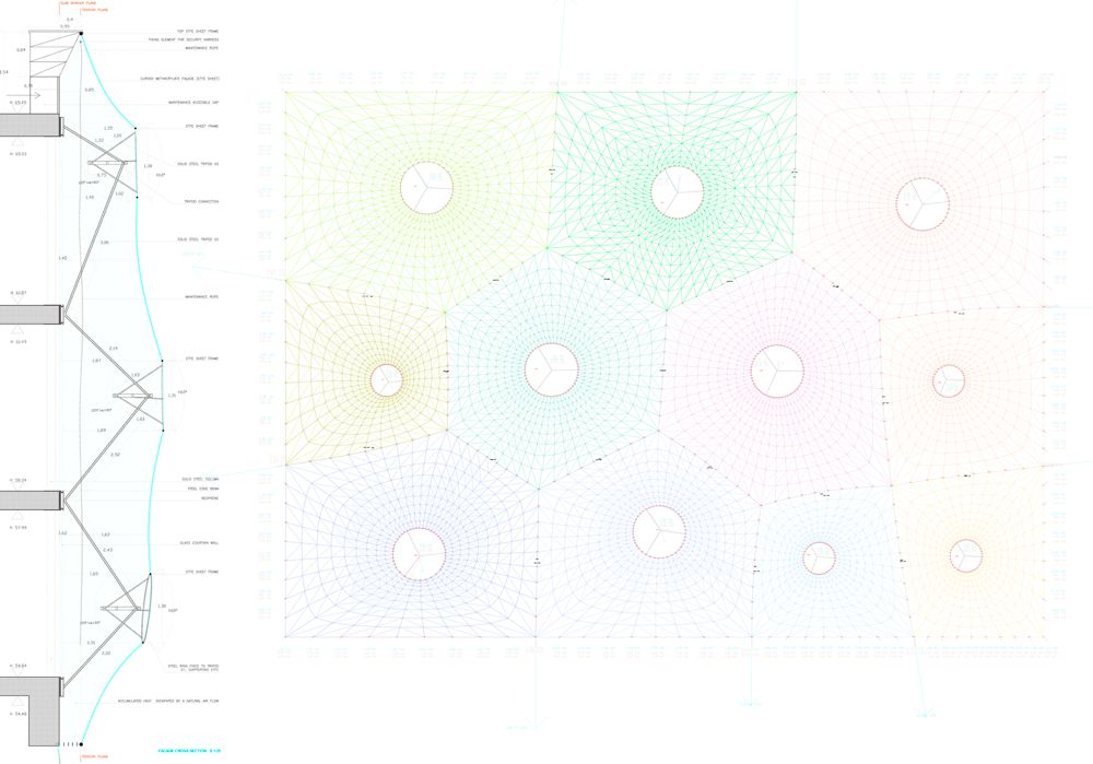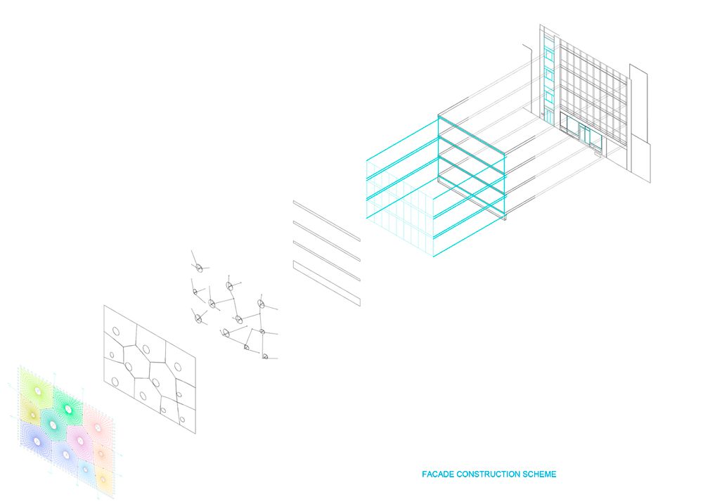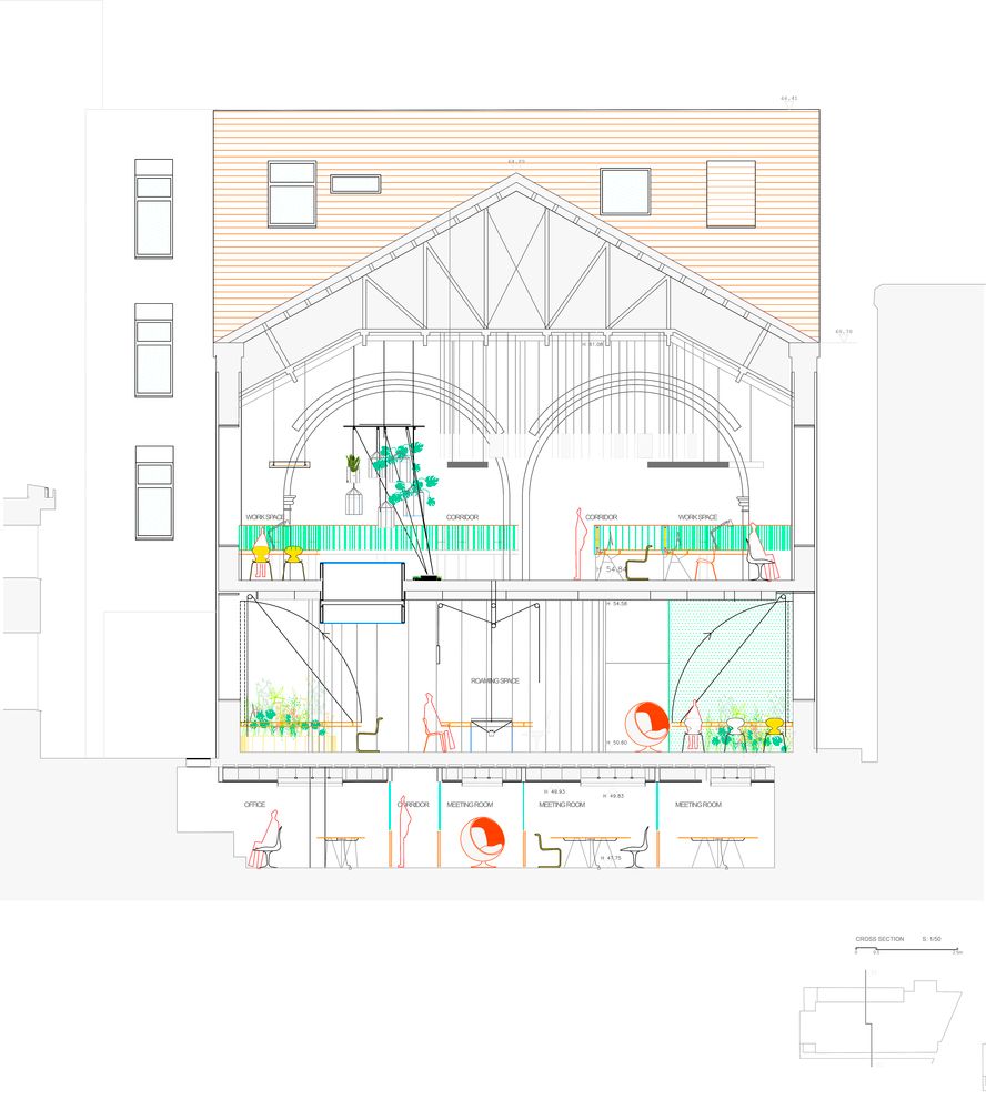 能让 London Fields 拥有吸引人眼球的特质,办公楼的建筑外立面是最大功臣。这栋建筑原本是一栋建于 1800 年的老剧院,二战后在 20 世纪 60 年代,曾经重建一次,成为了一个四层楼高的建筑。后来,设计师从传奇建筑师 Frei Otto 那里得来了灵感,决定了外立面的幕墙结构,并采用一种叫做 ETFE 膜的材料。ETFE 就是「乙烯-四氟乙烯共聚物」,是一种含氟的塑料高分子材料,最早由杜邦公司于七十年代研发,是一种轻质、阻热的薄膜材料。用 ETFE 膜所做的建筑,有着新的美学效果,而且能替代其他更昂贵的透明半透明材料,例如我们所熟知的北京水立方,就是用这种材料做的 ▼而 London Fields 的 ETFE 膜,表面的形状和纹理,则是通过计算力、重力反作用力和曲率变形之间的空间关系,来决定的 ▼当然,对于光线和室外景色的考虑,也在计算的范围之内 ▼而且幕墙的安装并不像其表面看起来那样「清新简单」。整个幕墙的结构大致是下图这样 ▼从建筑本体的表面到安装结构体、上薄膜,整个过程则大概是这样 ▼半透明的薄膜幕墙可以通过特定的纹理和层叠来调节光照,ETFE 的低摩擦系数还可以防止粉尘附着在表面,从而减少维护成本 ▼出来的效果也非常好,整体赋予了建筑一种动态的感官,同时也让整个建筑看着给人感觉非常轻松而亲切 ▼与自然亲近,尽可能让室内与外界产生连接,是 Second Home 所有的办公空间所坚持的「原则」。同时,也要将位置之间的走道、桌椅是否符合人体工学等因素考虑进去,下面是相关的草图分析图 ▼内部空间的风格非常活泼。颜色的搭配非常「撞」,充满了元气感 ▼并且可以注意到,在室内空间中,透明、轻盈的材料被大量地运用。并且拥有非常多种不同形态的休息区、工作区 ▼独特的还有一些个人工位的位置,采用了像是圆环一般的桌子,让那个与天花板上的功能装饰物形成呼应 ▼「圆」这个元素也可以在各处看见,例如天花板上的圆形镜面,这样做可以从视觉上增强空间感 ▼或者是采用圆形的窗户,可以从这里看到室外的景色,并且将每一个不同的空间连接起来 ▼从这边可以看到前面介绍的薄膜幕墙所带来的好处,跟好的光照、更具有亲切感的隐私保护 ▼另外,在每一层楼之间的天花板与地面都有圆形窗户所链接,可以从这里看到楼下或者楼上的空间。这样做同样也是在打通不同楼层之间的隔断,从而增加整栋大楼内部空间的连接感 ▼可以注意到,在办公空间中采用了不同颜色的内饰,摆脱了传统办公室千篇一律的无聊。同时也为空间赋予了多功能的性能,这种创新精神为在其中办公的人们带来了巨大的精神可能性 ▼另外,室内其实也结合了旧剧院的一些原始元素,例如天花板采用了材料,是隔音的 ▼在这个区域,你可以看到工位被曲线造型的隔板所分离。独特的是这独特的隔板表面带有波浪形状,同时也能提供均匀稳定的光源 ▼还有非常多好玩的小细节,例如下图中的那些隔音板的摆放,围绕着绿色盆景 ▼或者是作为会议室的地区,有着更加独特的配色以及各种不同形态的形状与元素 ▼在整个室内设计中,能感觉到设计师特别关注空间与环境质量之间的关系,同时利用空间来影响身在其中的人们的生活方式。超越功能主义,赋予传统空间更加亲和而具有创新的设计形态,是这个办公空间设计最让人感到「舒服」的一点。