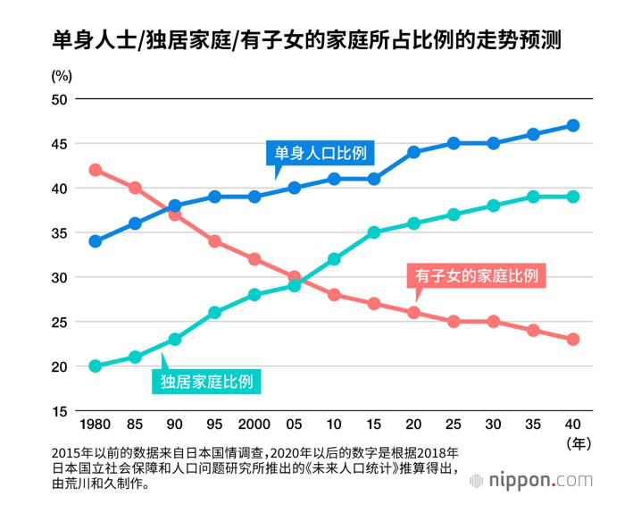 《第四消费时代》作者三浦展指出,共享生活方式不断扩大的背景之一,就是单身化。书中预测,1990年出生的女性到50岁时,将有23.5%的人未婚,剩余的76.5%的人中有36%(即整体的27.5%)离异,加起来有51%的女性为单身,或单身母亲。加上丧偶,这个数值会更高。