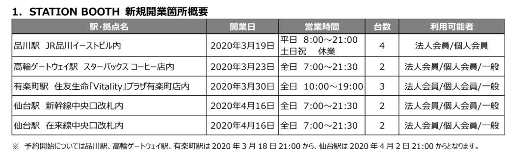 试行站点为东京站、新宿站、品川站,每个站设4个“STATION BTH”的单人办公间。开放时间为7:30至21:00,费用为250日元/15分钟,开业促销价为150日元(约9.8元,实时汇率)/15分钟。